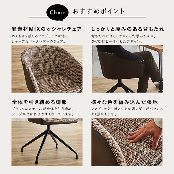 チェアは様々な色を編み込んだ特徴的な張地と背面のシンプルな張地が調和したデザインで、