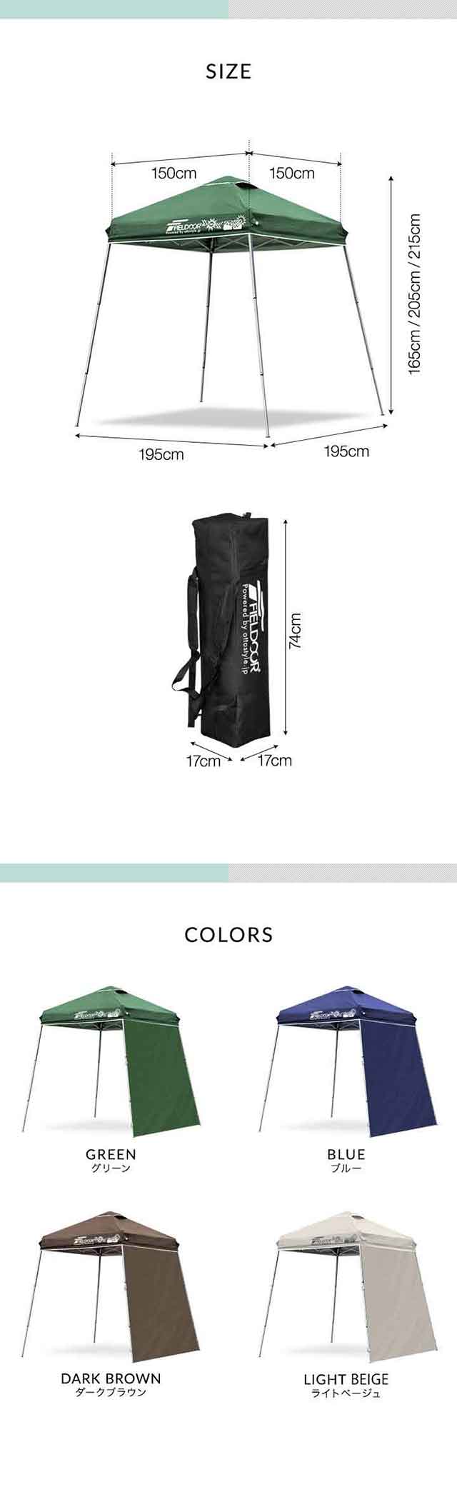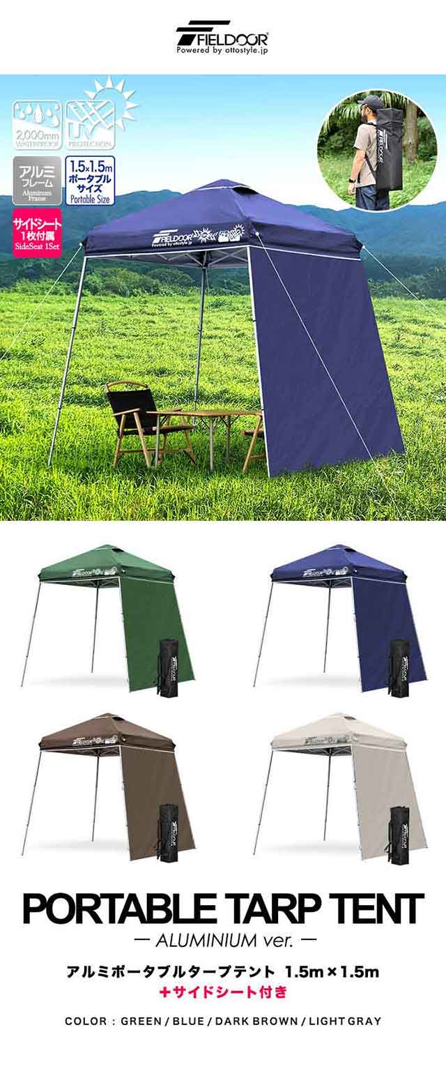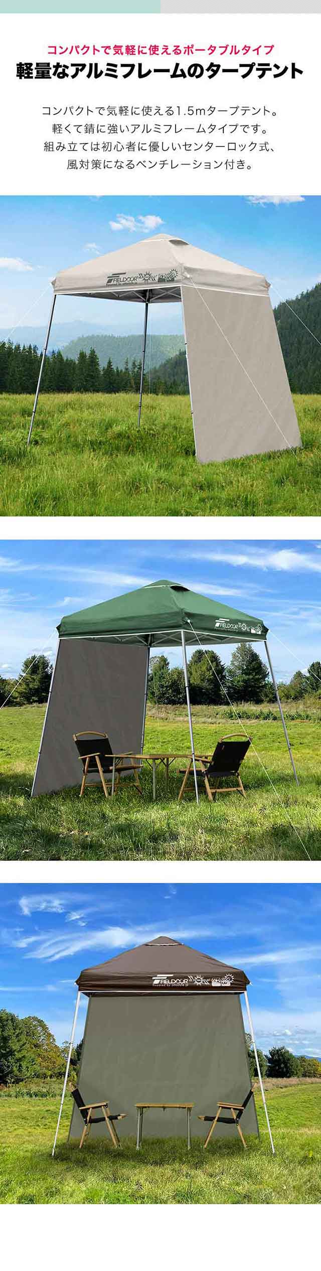 ポータブルタープ テント タープ サイドシート1枚付き 横幕セット 1.5m×1.5m 軽量 アルミ 150cm コンパクト 収納 小型 持ち運び 簡単 設営 ワンタッチタープ ワンタッチテント UV加工 撥水 ポータブルタープテント FIELDOOR 1年保証 送料無料