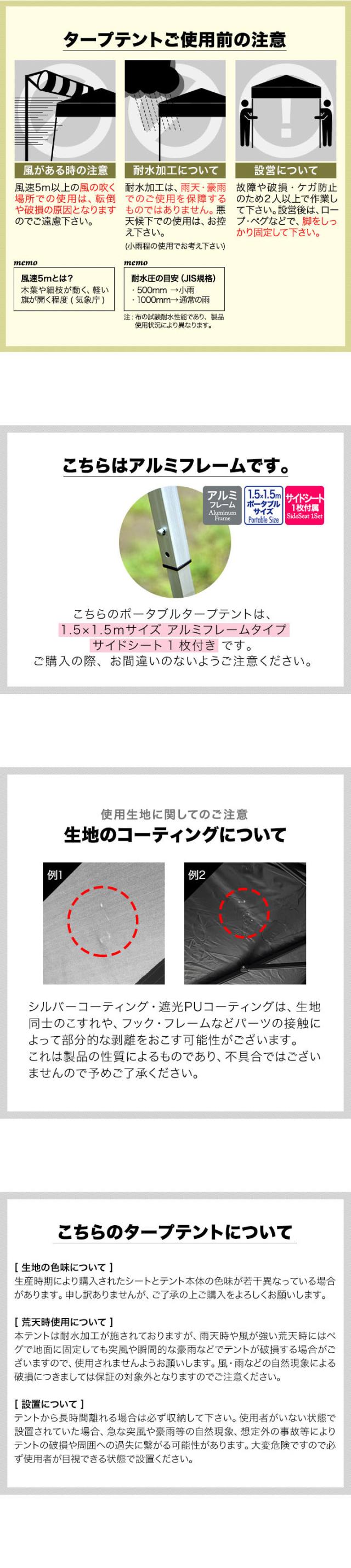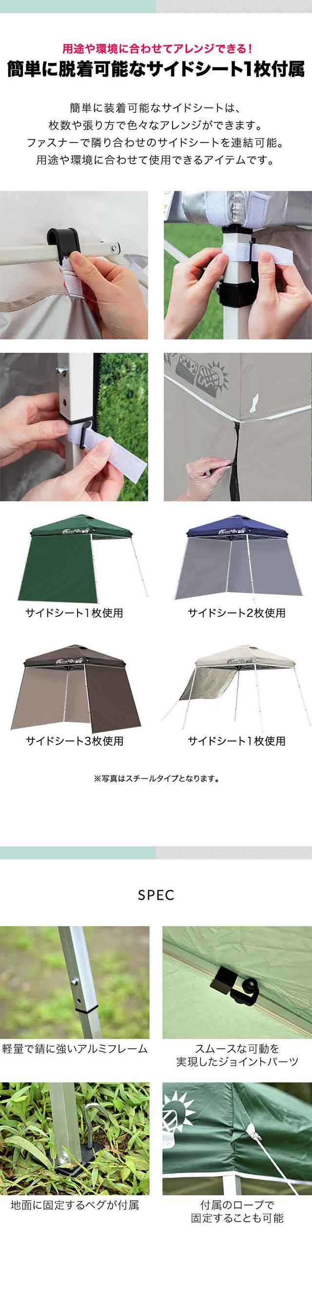 | 付属品: ・専用サイドシート(1枚) ・ロープ ・ペグ ・専用収納ケース ・取扱説明書(日本語) |