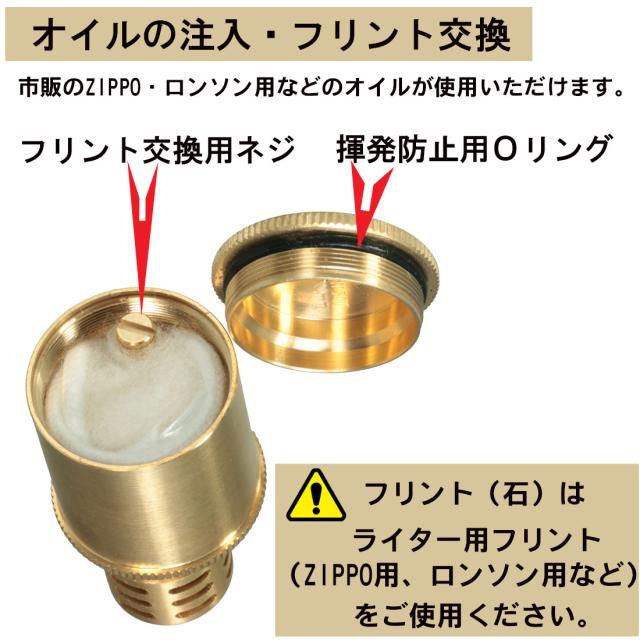 | ご注意 | ・フリント(石)はライター用フリント(ZIPPO用、ロンソン用など)をご使用ください。 マーベラス・ダグラス純正フリントはサイズ違いで使用できません。 ・真鍮素材の特性上、酸化変色や多少の汚れ、キズ等ある場合がございます。使い続けることでより使用感が深まりますのでご了承下さい。 光沢を維持するには、市販の真鍮みがき剤等をご利用下さい。 ・ お客様のご利用のブラウザの環境により商品の色合いが実際のものと多少異なる場合が御座いますので、予めご了承ください。 |