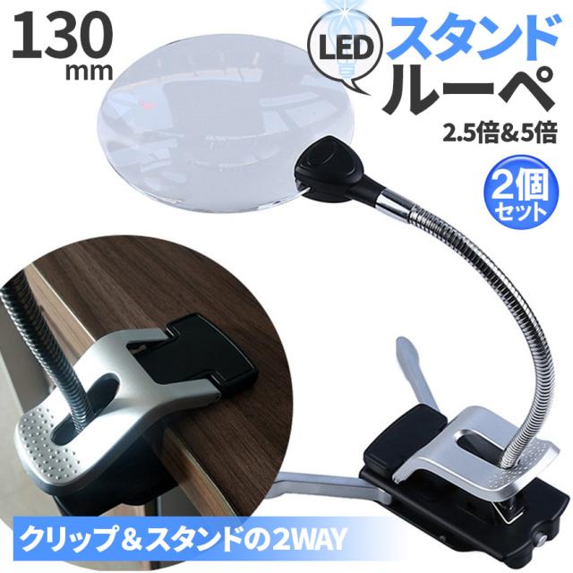 スタンドルーペ ルーペ LED付き 13cm 2個セット スタンド クリップ アーム付き 拡大鏡 虫眼鏡 虫メガネ 読書 新聞 観察 プラモデル 精密作業