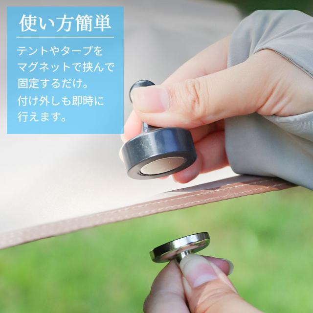 テントやタープを磁石で挟んで使用するマグネットフックです。