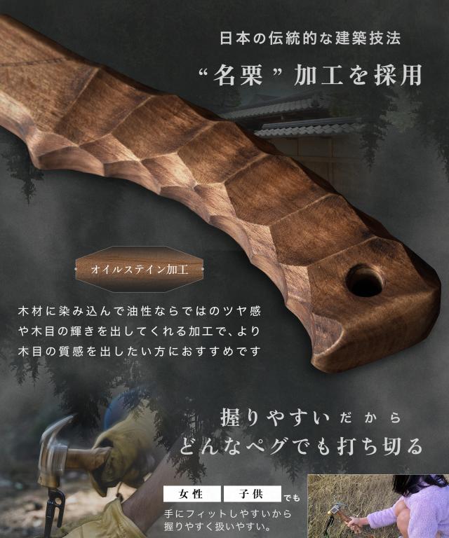 木柄を短くコンパクトで手の小さな方でもペグを打ちやすく命中させやすいペグを打つために開発されたショートペグハンマーです。