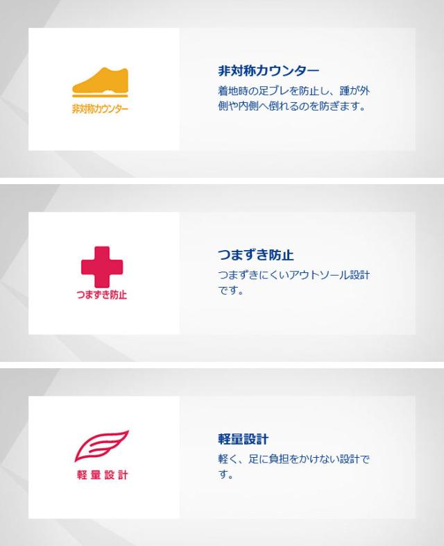 内側よりも外側が長いカウンターを搭載することで踵が外側に倒れるのを防ぎます。