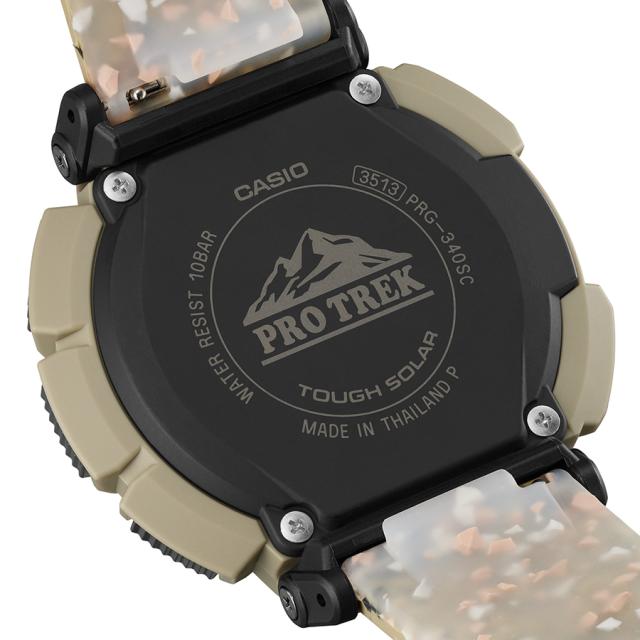 ベースモデルのPRG-340と同様、ケースおよび回転ベゼルと樹脂製の裏蓋には環境負荷の低減が期待されるバイオマスプラスチック樹脂を採用、環境への配慮を形にしました。