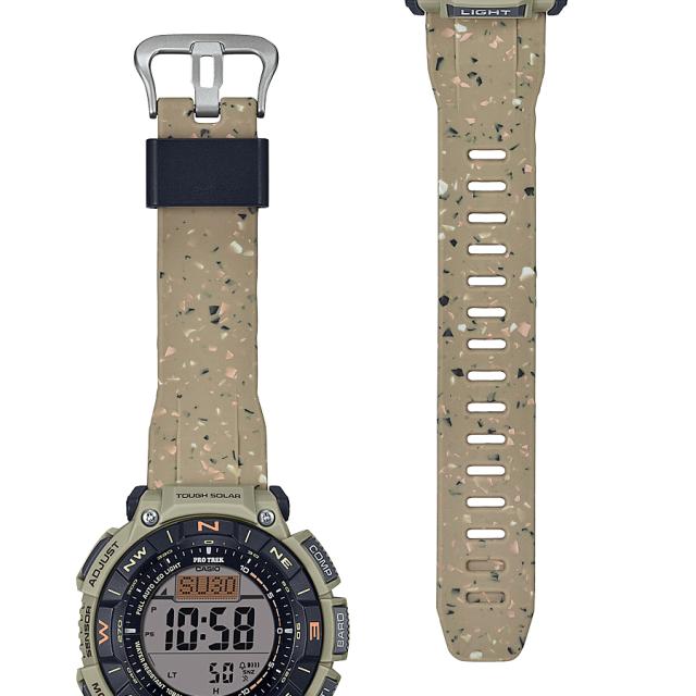 PRG-340SCには、生産工程で出た端材を再生素材として練り込んだデュラソフトバンドを採用しています。PRO TREKとしては、デュラソフトバンドに初めて再生素材を取り込んだモデルとなっており、環境負荷の低減が期待されています。