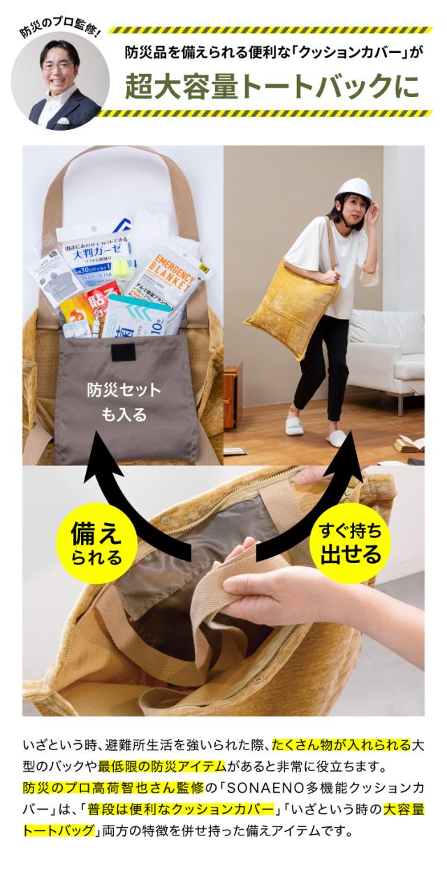 ソナエノ sonaeno 多機能 クッションカバー イエロー グレー 大容量 トートバッグ 洗える エコバッグ 防災 アウトドア キャンプ 車 避難所 防災用品 入れ物