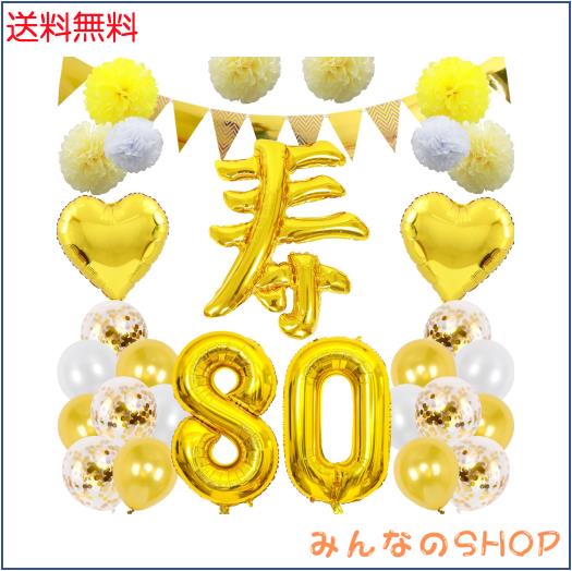〔豪華なセット内容〕「80」数字バルーン×各1個、「寿」文字バルーン×1組、フラッグガーランド×1本、紙吹雪入りバルーン×6個、ゴールドバルーン×6個、ホワイトバルーン×6個、ハート型バルーン×2個、黄色ペーパーボール×2個、ライト黄色ペーパーボール×4個、ホワイトペーパーボール×2個、おまけ:リボン×2個、ドットシール×2枚。※商品の取り扱いは6才以上のお子様にお勧めします。ガーランドはお客様自身で糸通しをお願い致します。バルーン類は全て空気の入ってない状態でのお届けです。お届け後ご自身で膨らませてご使用下さい。