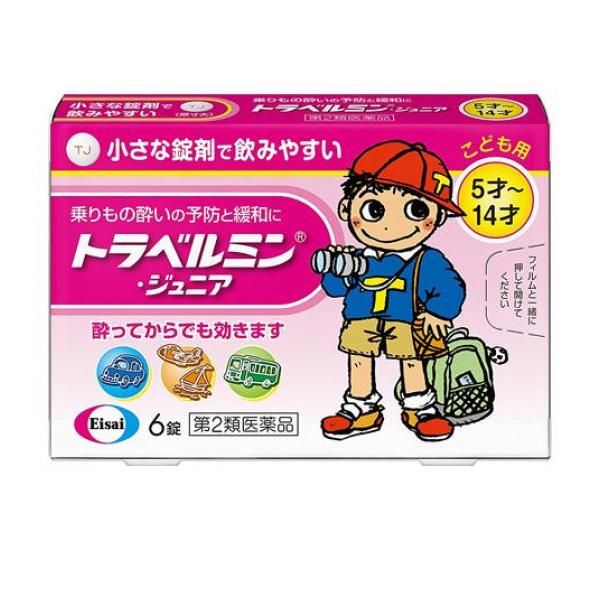 トラベルミン・ジュニアは,乗りもの酔い症状の予防及び緩和に有効な,子供用の乗りもの酔い薬です。酔う心配がある場合,乗る30分前の服用により,乗りもの酔い症状が予防できます。また,酔ってしまった時でも,服用によって乗りもの酔い症状である「めまい」「吐き気」「頭痛」を改善し,旅行を楽しむことができます。