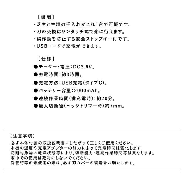 充電式2wayミニバリカン 充電式 2way ミニバリカン バリカン 生垣剪定 芝生刈込 芝生 生垣 手入れ 誤作動防止 安全ストップキー付