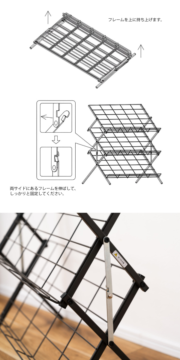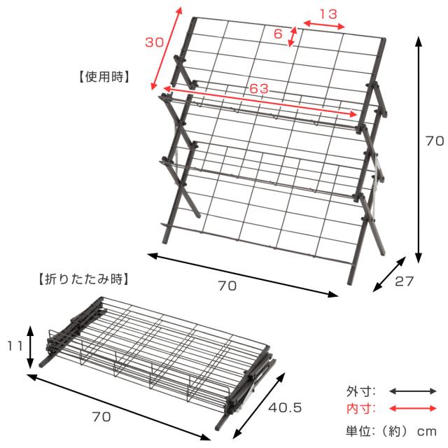 | サイズ | 約 幅70×奥行23×高さ70(cm) 1段あたりの内寸:約 幅63×奥行30(cm) 折りたたみ時外寸:約 幅70×奥行40.5×高さ11(cm) |