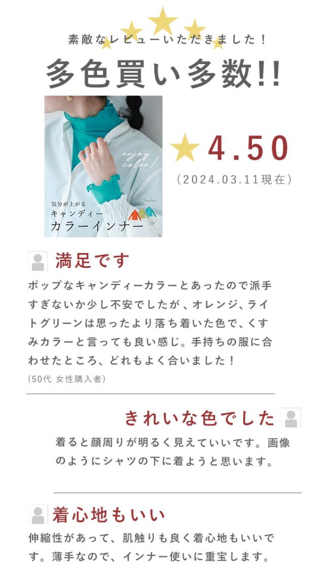 再入荷9月4日 気分 が 上がる キャンディー カラー インナー トップス レディース ファッション 秋服 春服 着回し 重ね着 レイヤード cawaii w60559ps 日常使い キレイめ シンプル ミセス 30代 40代 50代 母の日