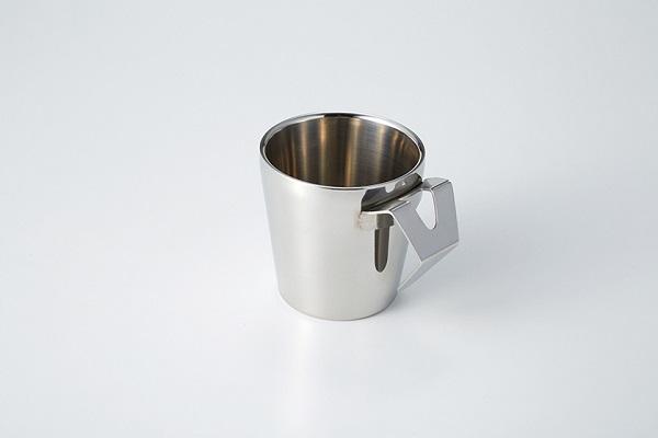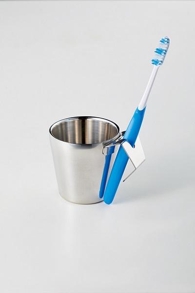 取っ手を下にして置くと水切れがよく、カップの底に水がたまらないので清潔にお使いいただけます。取っ手の穴に歯ブラシなどを差すことができます。口当たりのいい二重構造・輝きのある鏡面仕上げになっております。小ぶりなサイズで置き場所に困りません。