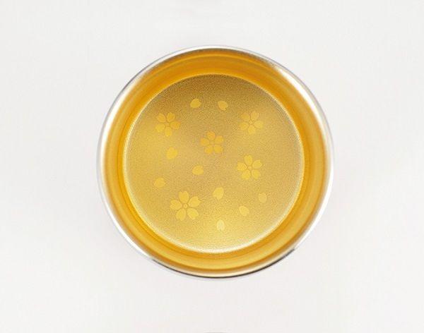 二重構造なので氷を入れても結露が出にくく、温かさ・冷たさが長持ちします。内面、外面にブラスト加工をし、尚底面にレーザー加工でさくらの模様を入れ、その上に24金メッキを施しました。今までにない和と洋の両方に合うワンランク上のスタイリッシュなデザインタンブラーに仕上げました。