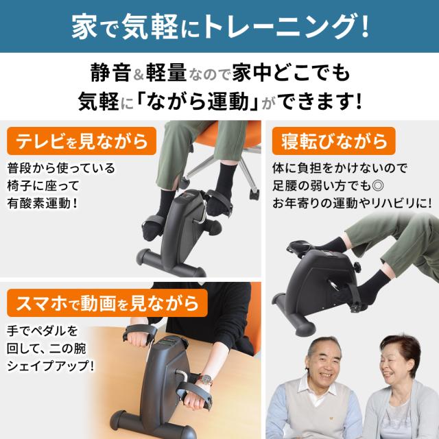 - 運動不足解消の為に購入しました。 椅子に座ってペダルを漕ぐタイプの 運動器具なので、無理な運動にならない ので良いと思います。