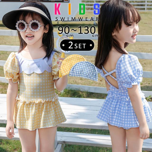 冬新作 キッズ 水着 女の子 ワンピース オールインワン スイムキャップ 2点セット パフスリーブ 半袖 フリル フレアスカート ギンガムチェック えり プリント バッククロス ショーツ一体型 水遊び 日焼け対策 幼稚園 保育園 小学生