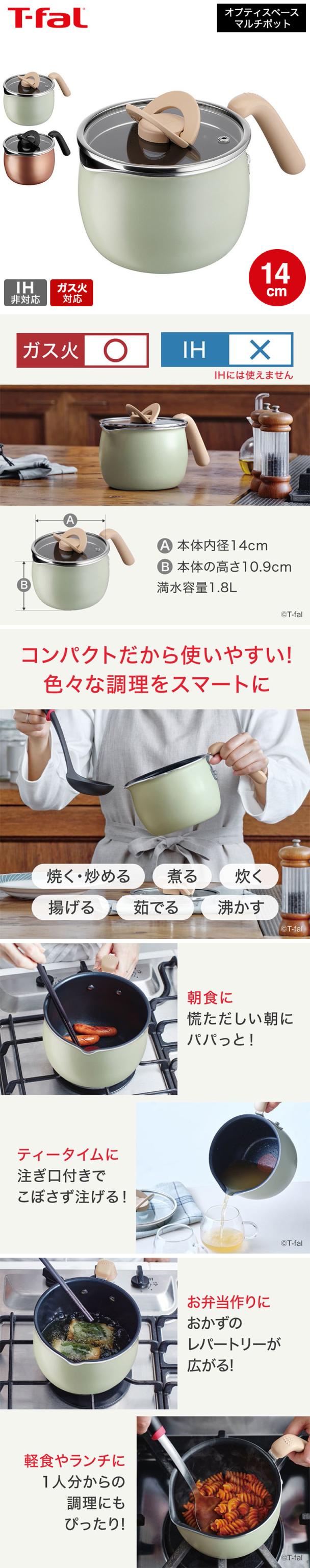 ティファール T-fal 鍋 オプティスペース マルチポット 14cm A54587 A54787 片手鍋 万能鍋 万能調理鍋 ガラス蓋 ガス火対応 IH不可 食洗機対応 食洗機可 煮る 焼く 揚げる 炊く 沸かす ケトル