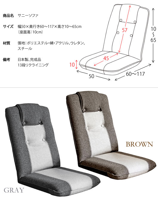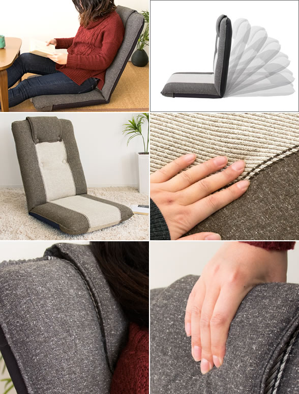 座椅子 ハイバック 完成品 日本製 国産 リクライニング おしゃれ フロアチェア フラット ファブリック 首 クッション 幅50cm 奥行60〜117cm 高さ10〜65cm 座面高さ10cm 和室 洋室 リビング こたつ 一人暮らし ワンルーム シンプル カジュアル グレー ブラウン バイカラー