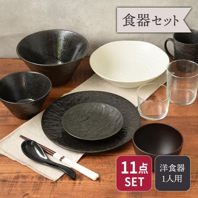 新生活応援 おしゃれな食器11点セット 1人用セット 割引 スレート調+α ブラック 食器セット セット食器 ペア食器 夫婦茶碗 ファミリー食器 家族食器 引っ越し 単身赴任 新生活 黒い食器 マグカップ マグ カップ 箸 はし カトラリー 木製