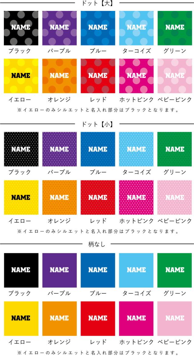 お好きなシルエットが選べて、カラーリングは10色から選べます。デザインパターンは「柄なし」「ストライプ」「ななめストライプ」「ドット【小】」「ドット【大】」の5種類から選べます。アルファベット表記のお名前をお入れして、オンリーワンな世界に一つだけのアイテムが完成です♪