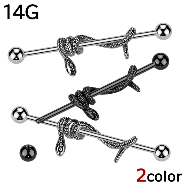 ボディピアス 14G インダストリアル スネー クラップ 蛇 ロング ストレートバーベル [ 軟骨ピアス 耳ピアス 316Lサージカルステンレス ]