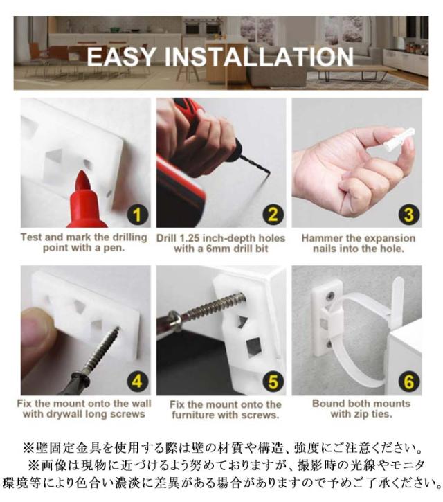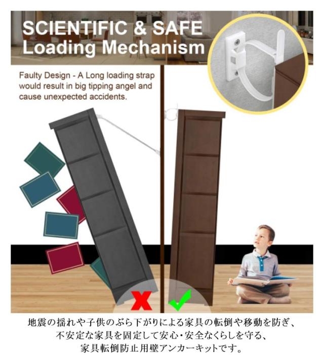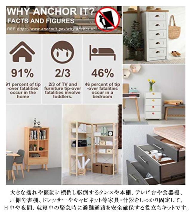 | 大きな揺れや振動に横倒し転倒するタンスや本棚、テレビ台や食器棚、戸棚や書棚、ドレッサーやキャビネット等家具・什器をしっかり固定して、日中や夜間、就寝中の緊急時に避難通路を安全確保する役立ちキットです。 家具の転倒防止は建物の耐震化と並ぶ効果的な地震対策。地震の揺れや子供のぶら下がりによる家具の転倒や移動を防ぎ、不安定な家具を固定して安心・安全なくらしを守る、家具転倒防止用壁アンカーキットです。 柱や鴨居、壁面の縦または横方向に通る桟と家具・什器の背面や側面などに付属ブラケットをネジ留めし、地震の揺れに家具が一体的に動くよう、長さ調整可能なナイロン製結束バンド/ストラップを取り付けます。 ※壁固定金具を使用する際は壁の材質や構造、強度にご注意ください。 ※画像は現物に近づけるよう努めておりますが、撮影時の光線やモニタ環境等により色合い濃淡に差異がある場合がありますので予めご了承ください。 | |