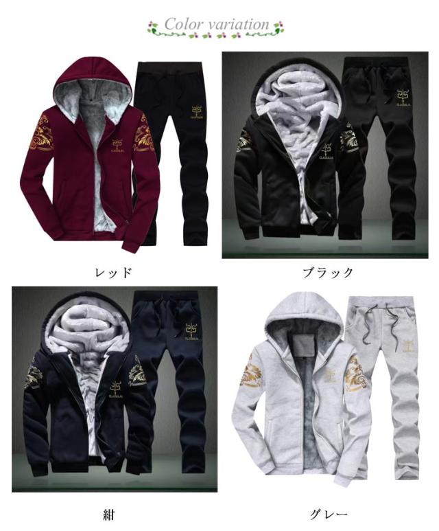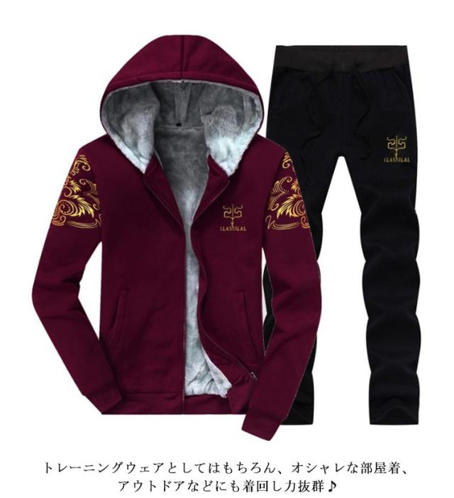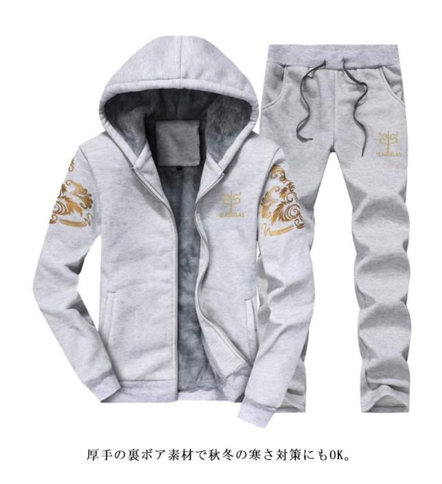 | 大人の雰囲気が漂うスポーティーでオシャレなジャージセットアップです。 上下ともに目を惹くゴールドプリントがアクセントに トップスは気軽に羽織ることができるジップパーカー、ボトムスは履きやすいイージーパンツ仕様。 厚手の裏ボア素材で秋冬の寒さ対策にもOK。 トレーニングウェアとしてはもちろん、オシャレな部屋着、アウトドアなどにも着回し力抜群♪ | |