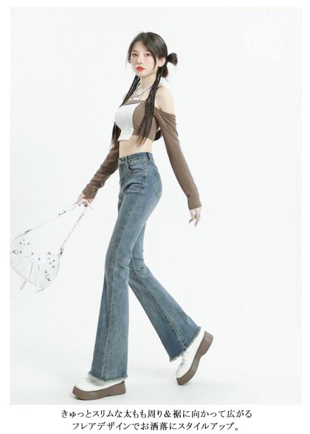 デニムパンツ フレアパンツ ブーツカット ジーンズ レディース ストリート スキニー タイトパンツ ベルボトム ジーパン 送料無料 ロングパンツ ストレッチパンツ 切りっぱなし 裾フリンジ