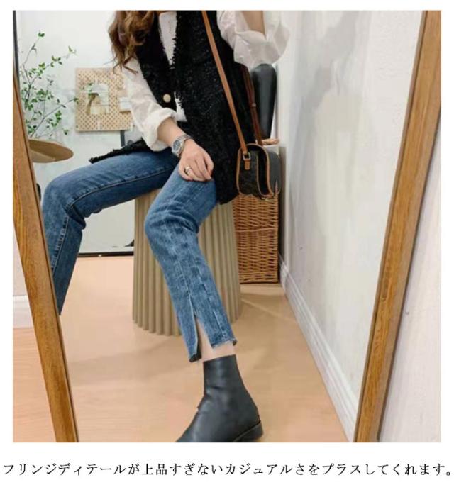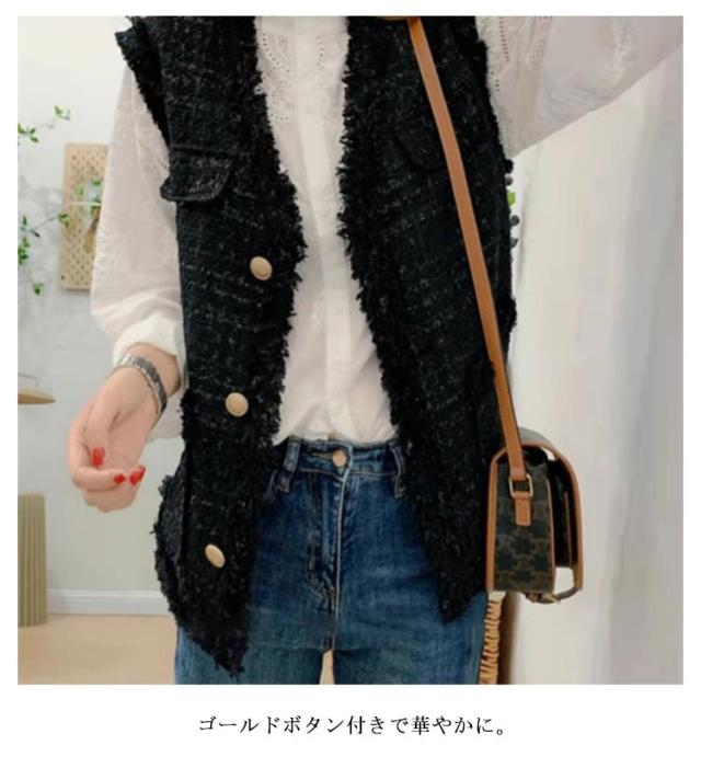 フリンジ ツイード ベスト レディース ノーカラー アウター ジレ Vネック ミドル丈 ツイード レイヤード ジャケット ボタン お出かけ 秋 冬 韓国ファッショ きれいめ 上品 おしゃれ フォーマル 卒業式 入学式 七五三 お宮参り 体型カバー 高見え