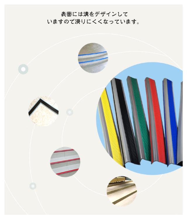 | 階段の角に合わせて貼るだけ、とても簡単! 防水仕様だから屋外での使用も安心です。 表面には溝をデザインしていますので滑りにくくなっています。 強力粘着タイプでしっかり固定できます。 ハサミで簡単にカットできるので階段の長さにあわせて自由にカスタマイズできます。 | |