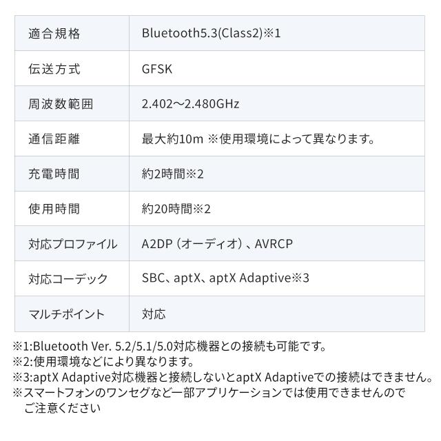 ※本製品は「apt-X」、「apt-X Adaptive」対応ですが、相手側が「apt-X」、「apt-X Adaptive」に非対応の場合は「apt-X」、「apt-X Adaptive」による接続になりません。