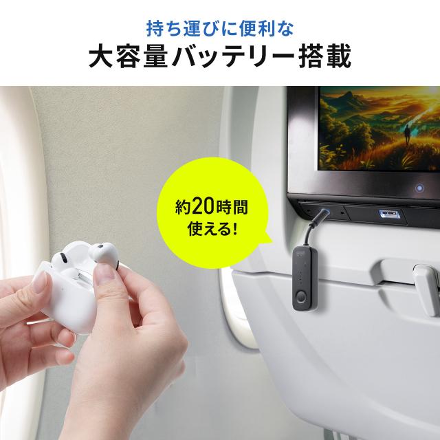 ●飛行機内エンタメやテレビの音声をワイヤレス送信できるBluetoothトランスミッターです。●3.5mmステレオミニプラグ接続だけでなく、付属の変換プラグで飛行機内のデュアルジャックにも対応します。
