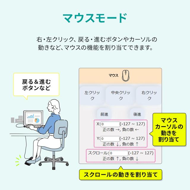 ●マウス操作のクリックボタン、戻る・進むボタン、スクロールボタン、カーソル移動などのすべてが割り当てできます。