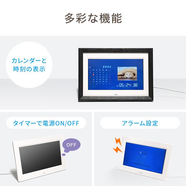 ●SDカードまたはUSBメモリを接続するだけで、写真のスライドショーを楽しめるデジタルフォトフレームです。●写真、音楽、動画を再生することができます。