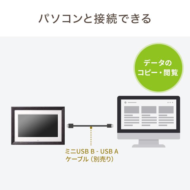 ●本製品とパソコンを別売りのminiUSB-USB Aケーブルで接続し、データのコピーや閲覧をすることができます。