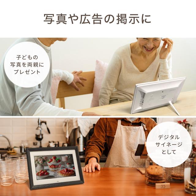 ⇒ご購入の前にご確認下さいSDカード、USBメモリ内の写真・動画・音楽を再生できるデジタルフォトフレーム。10.1インチの大きさでホワイト筐体のフレームと、ホワイト筐体にウッドフレームが付いた2色から選択できる。電源を入れてすぐ使える簡単設定で明るく見やすい1024×600画素画面搭載。玄関や窓口のデジタルサイネージやプレゼントに最適。名入れ対応。【WEB限定商品】