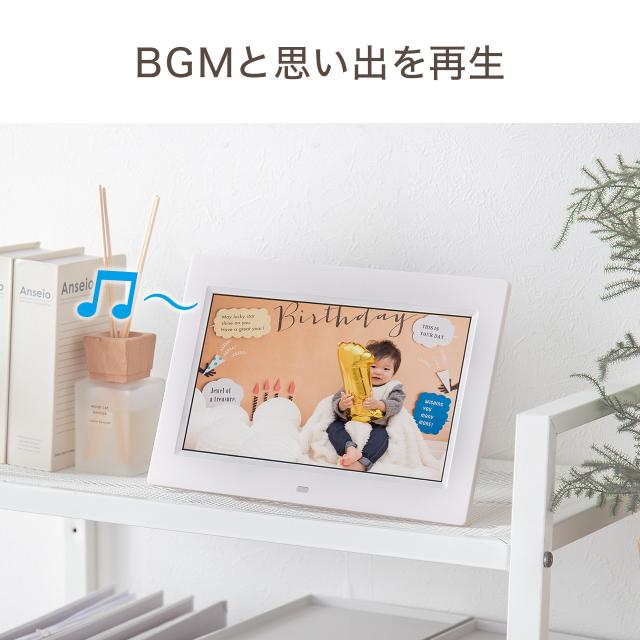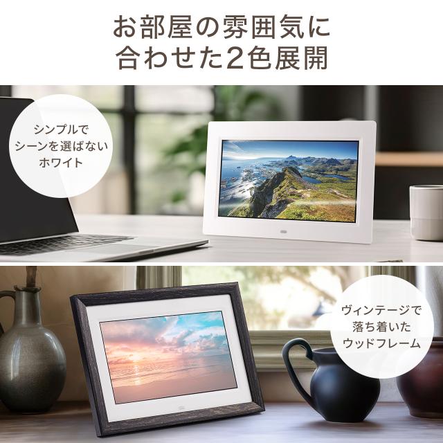 デジタルフォトフレーム 10.1インチ 1024×600画素 SD/USB 写真/動画/音楽 リモコン付き ホワイト スライドショー リピート再生 木目調フレーム付き 記念日 プレゼント[400-MEDI048WD]