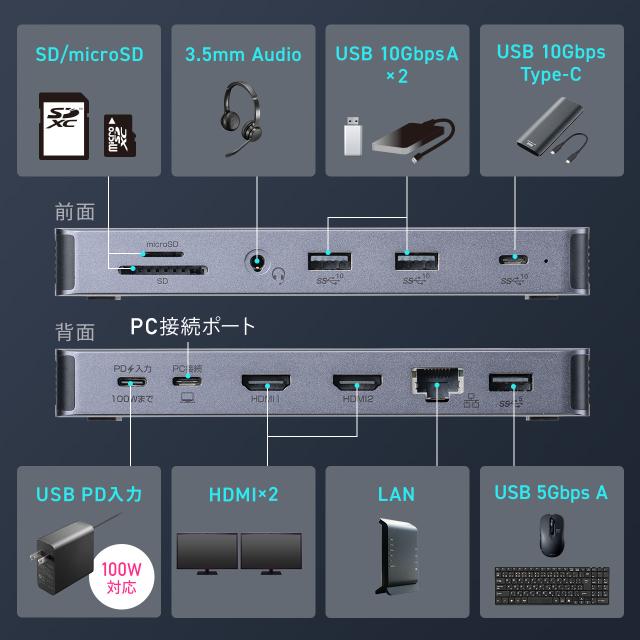 ⇒ご購入の前にご確認下さい4Kをまとめて2画面に出力できるUSB Type-C接続のドッキングステーション。縦置きできるスタンド付き。USB PD100W対応アダプタを接続すると、パソコン本体へ最大85W給電が可能。最大10Gbpsの超高速データ転送に対応。Type-C ×1、USB A×3、4極3.5mmジャックも搭載、1Gbpsまで対応するLAN端子も搭載した11in1。【WEB限定商品】