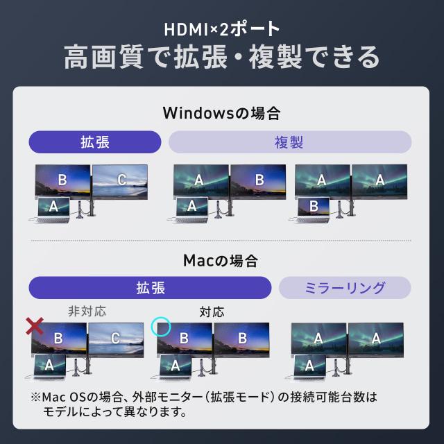 ●ディスプレイ1台出力時は最大4K60Hz(3840×2160)解像度に対応しています。2台接続時の最大解像度はそれぞれ最大4K30Hz(3840×2160)までサポートします。
