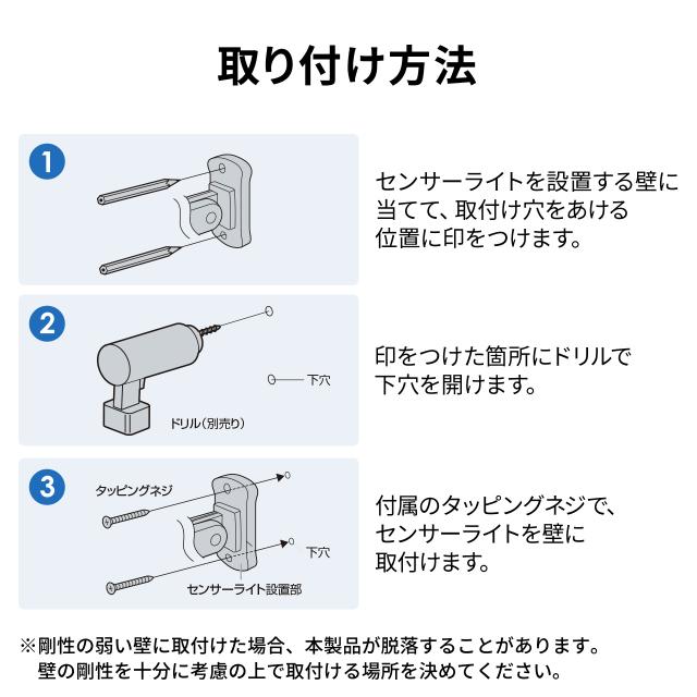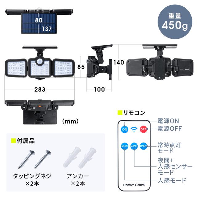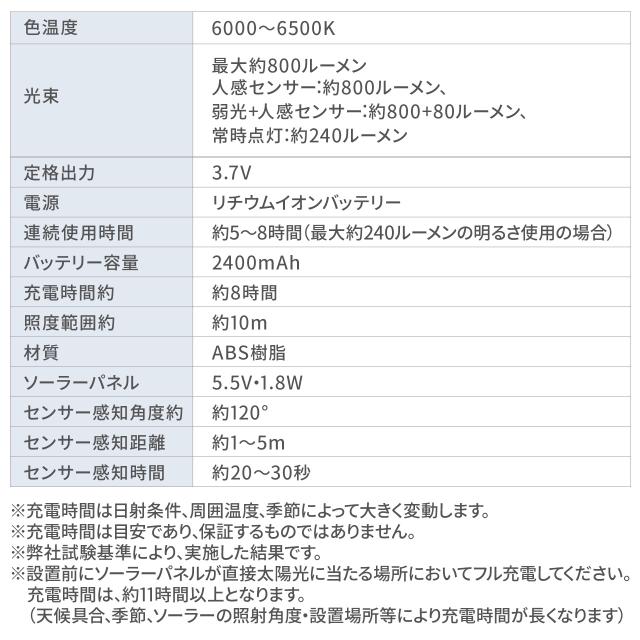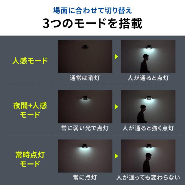 ●ソーラー充電式の人感センサーLEDライトです。●点灯モードは3種類あります(ON・OFFモード/ON・常夜灯モード/常夜灯モード)。