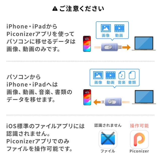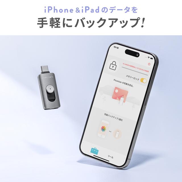⇒ご購入の前にご確認下さいLightningコネクタとType-Cコネクタで使用できるスマホ向けUSBメモリ「Piconizer4」。iOS専用アプリ「Piconizer」を使用してiPhone・iPad内の写真や動画のコピー、連絡先バックアップが可能。USB 10Gbps対応なので従来品の2倍の速度でデータ転送できる。MFi認証品。128GB。グレー。