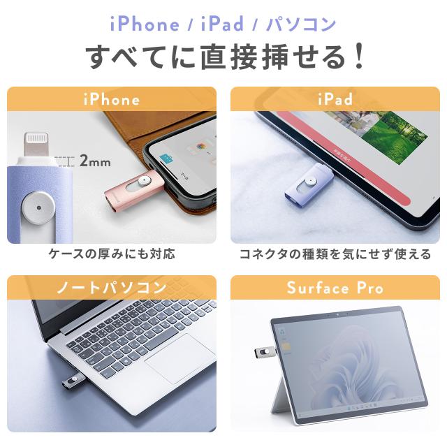 ●Lightningコネクタ、Type-Cコネクタで使用できるスマホ向けUSBメモリです。●Lightningコネクタ搭載のiPhone、iPad、Type-Cコネクタ搭載のiPhone15やiPad、Androidに直接挿して使用することができます。