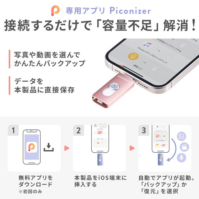 Lightning/Type-C USBメモリ 128GB グレー ローズゴールド バイオレット iPhone Android 対応 MFi認証 バックアップ iPad USB 10Gbps Piconizer4[600-IPLUC128G]