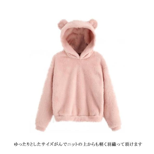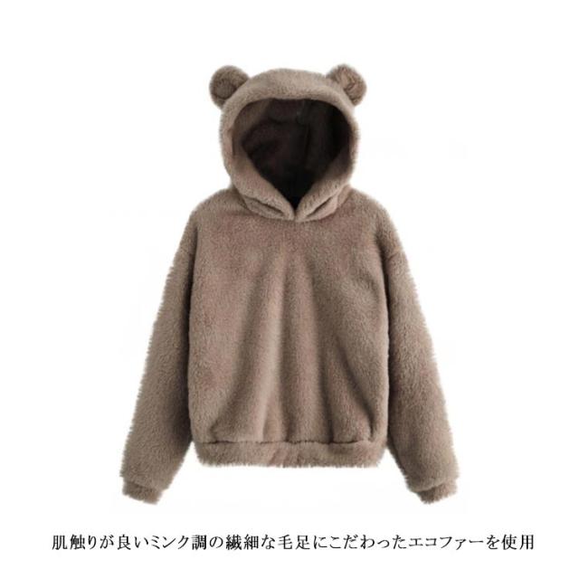 | モコモコふわふわファーコート 肌触りが良いミンク調の繊細な毛足にこだわったエコファーを使用 ゆったりとしたサイズがんでニットの上からも軽く羽織って頂けます ずっと触れていたくなるふんわりフェイクファーであたたかく、クマ耳付きフードデザインがかわいいファーブルゾンです | |