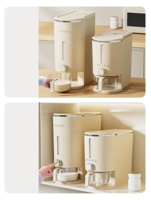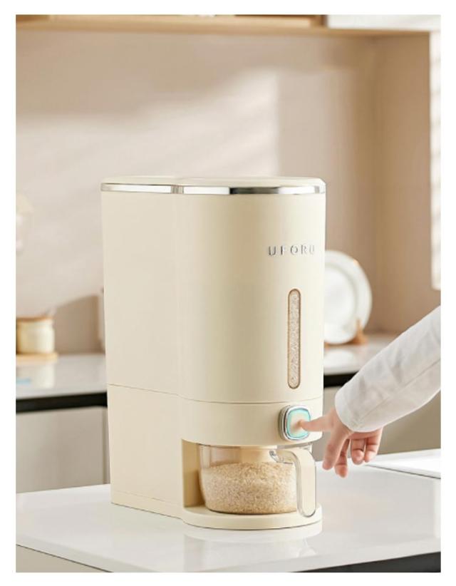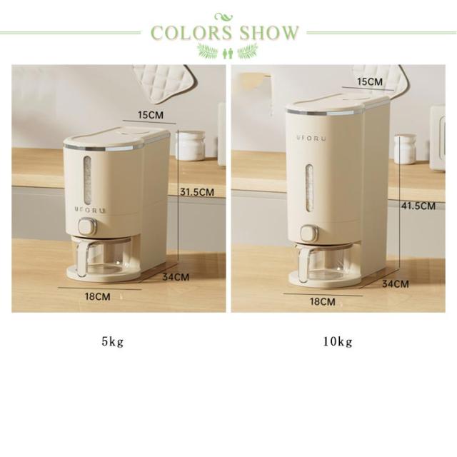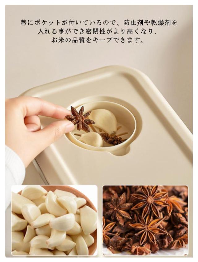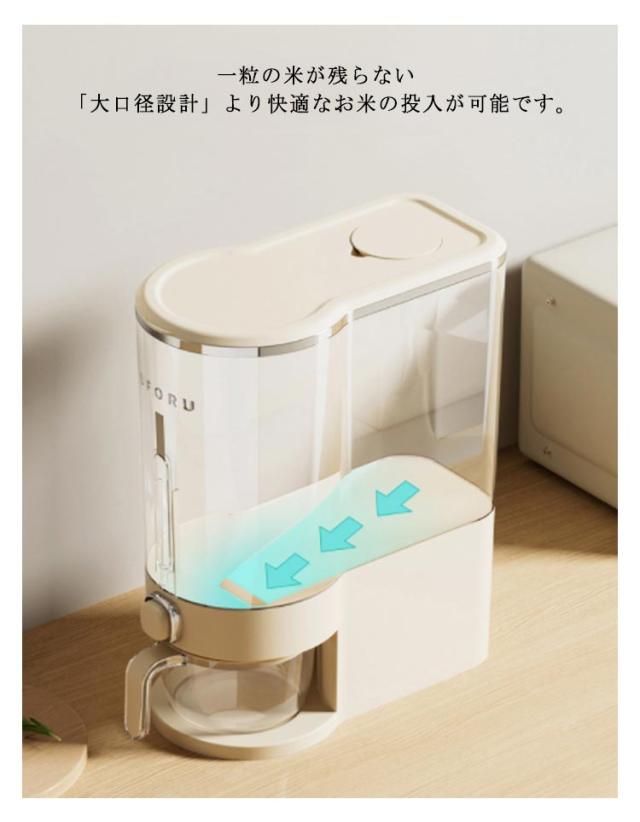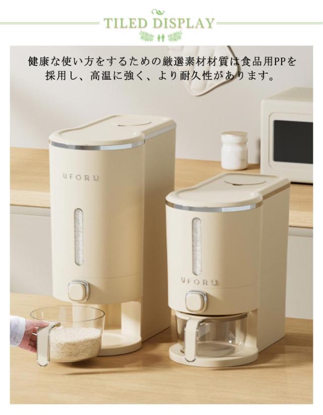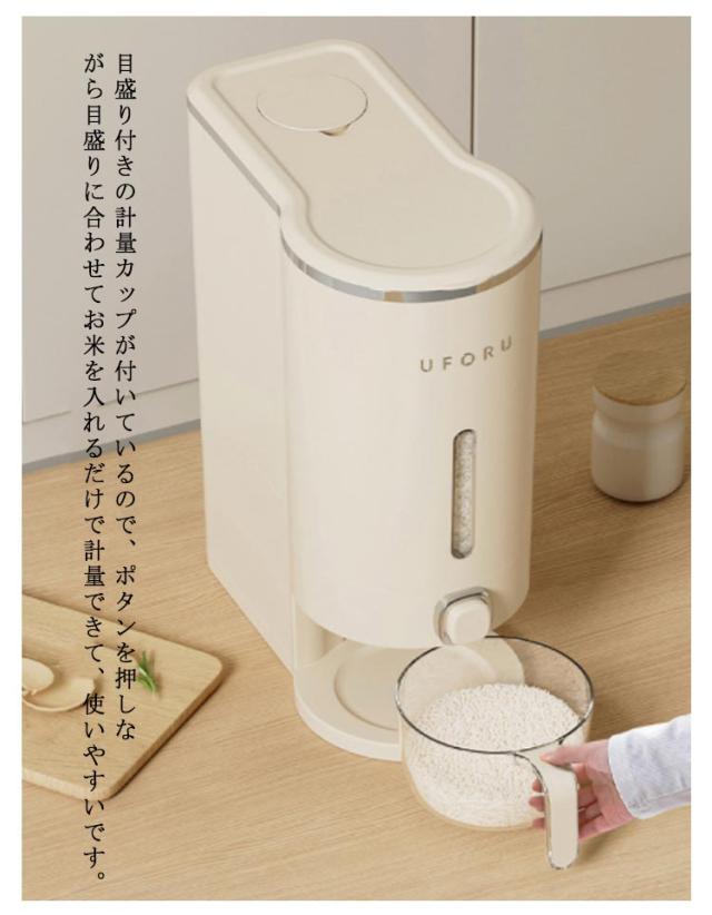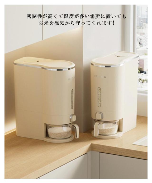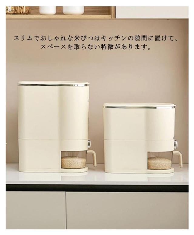 | お米を保存する容器であり、ボタンを押すことで簡単にお米を取り出すことができます。 健康な使い方をするための厳選素材材質は食品用PPを採用し、高温に強く、より耐久性があります。 一粒の米が残らない 「大口径設計」より快適なお米の投入が可能です。 目盛り付きの計量カップが付いているので、ポタンを押しながら目盛りに合わせてお米を入れるだけで計量できて、使いやすいです。 蓋にポケットが付いているので、防虫剤や乾燥剤を入れる事ができ密閉性がより高くなり、お米の品質をキープできます。 密閉性が高くて湿度が多い場所に置いてもお米を湿気から守ってくれます! スリムでおしゃれな米びつはキッチンの隙間に置けて、スペースを取らない特徴があります。 | |