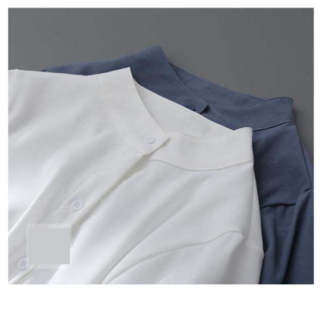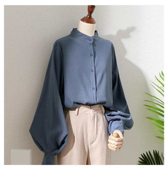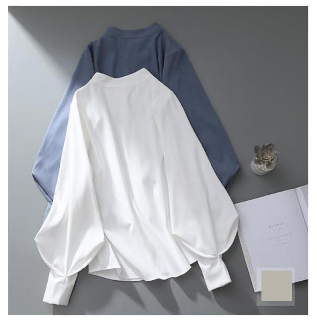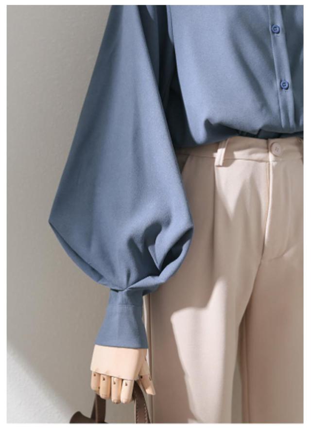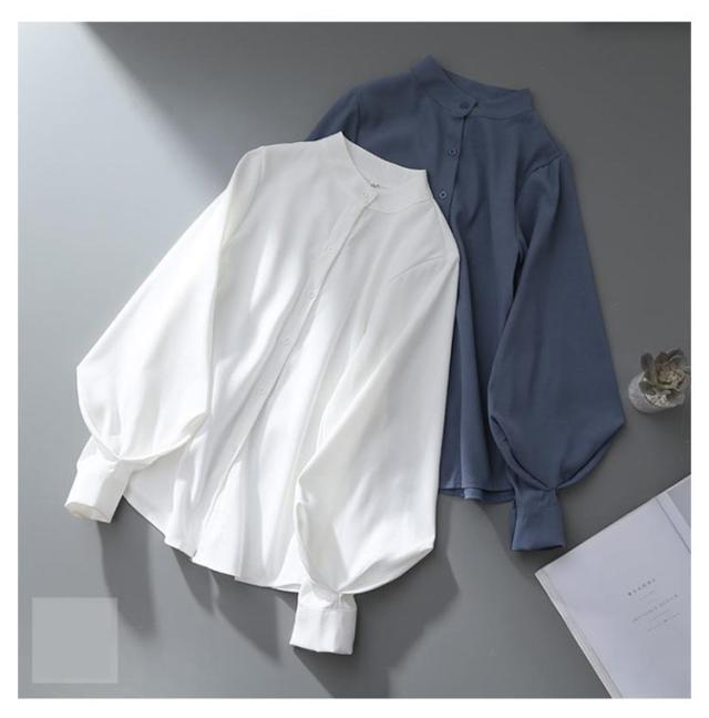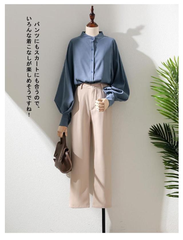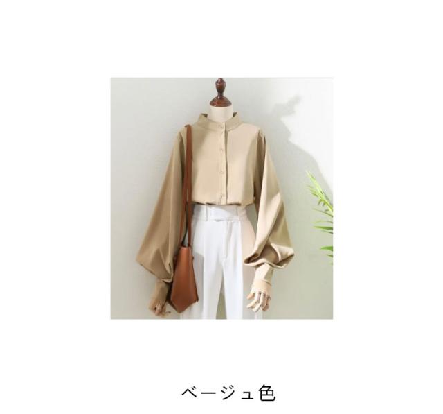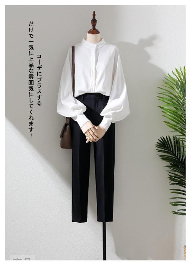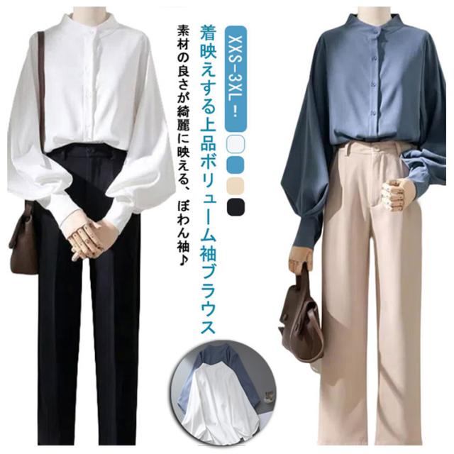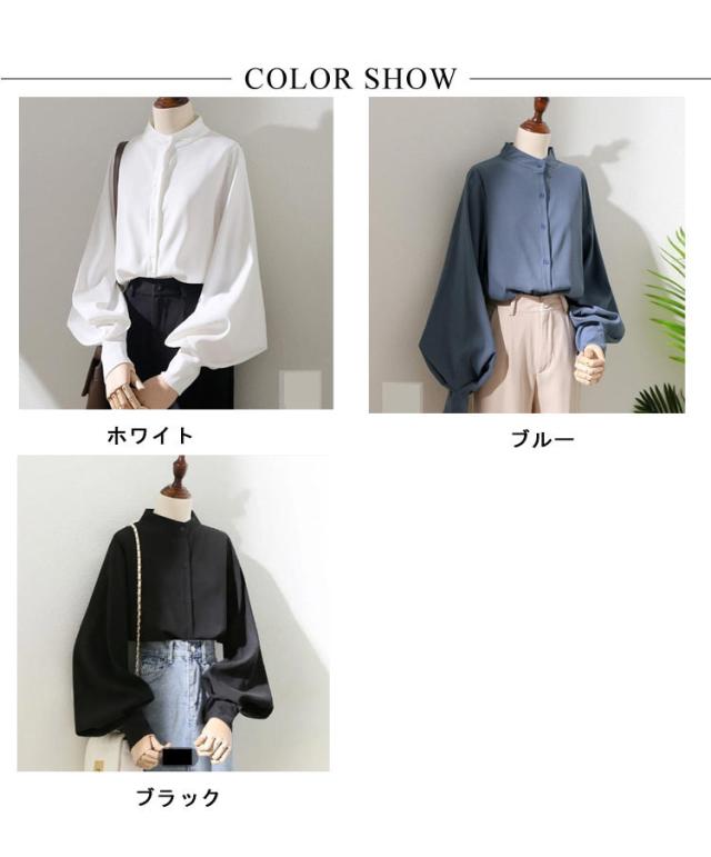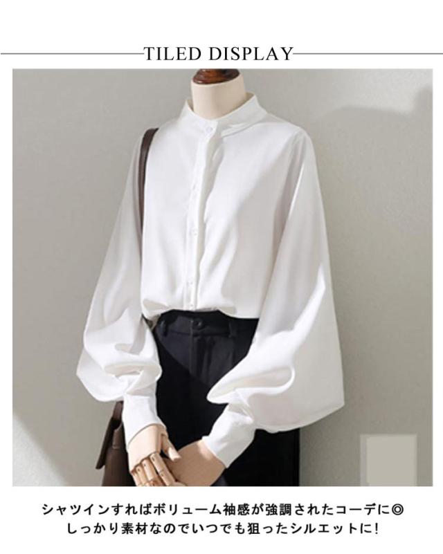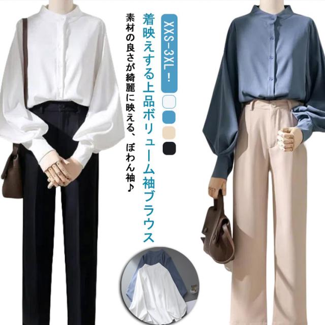 ボリューム袖 ブラウス 長袖 バルーン袖 レディース トップス シャツ 白ブラウス 白シャツ スタンドカラー 立ち襟 大きいサイズ ゆったり 薄手 無地 通勤 ビジネス オフィス 事務服 フェミニン カジュアル ブラウス きれいめ 送料無料 XXS〜3XL