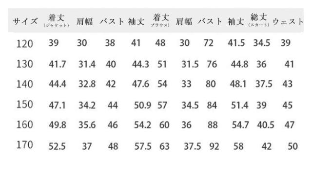 | サイズについての説明 | 4点セット( ジャケット、ネクタイ、ブラウス、スカート) サイズ表は画像をご参照ください |