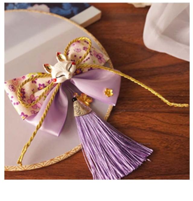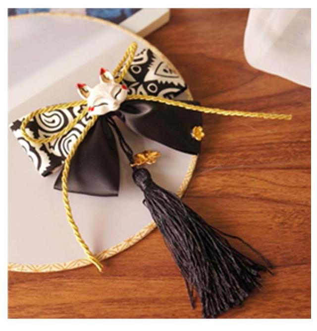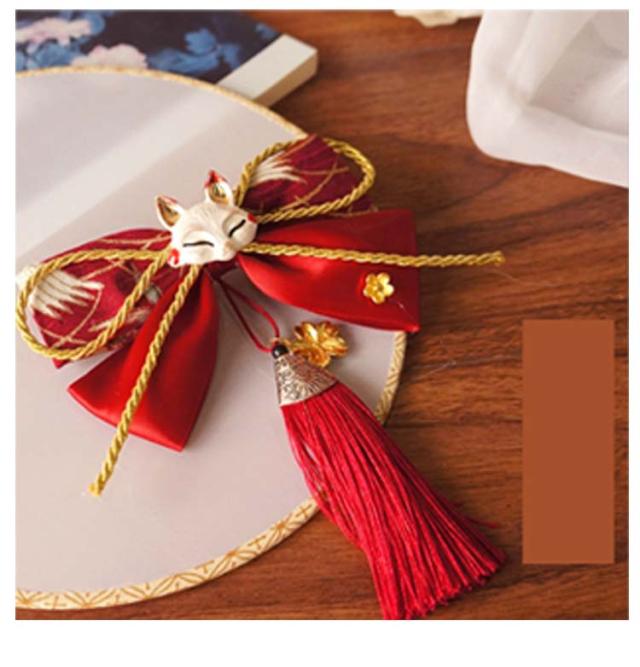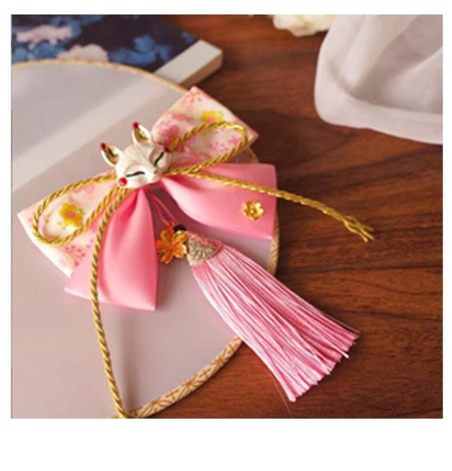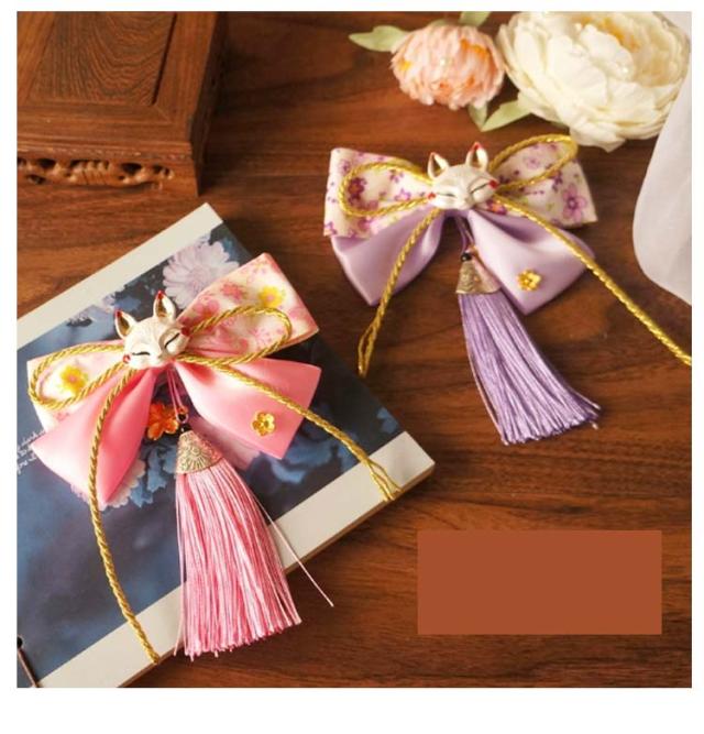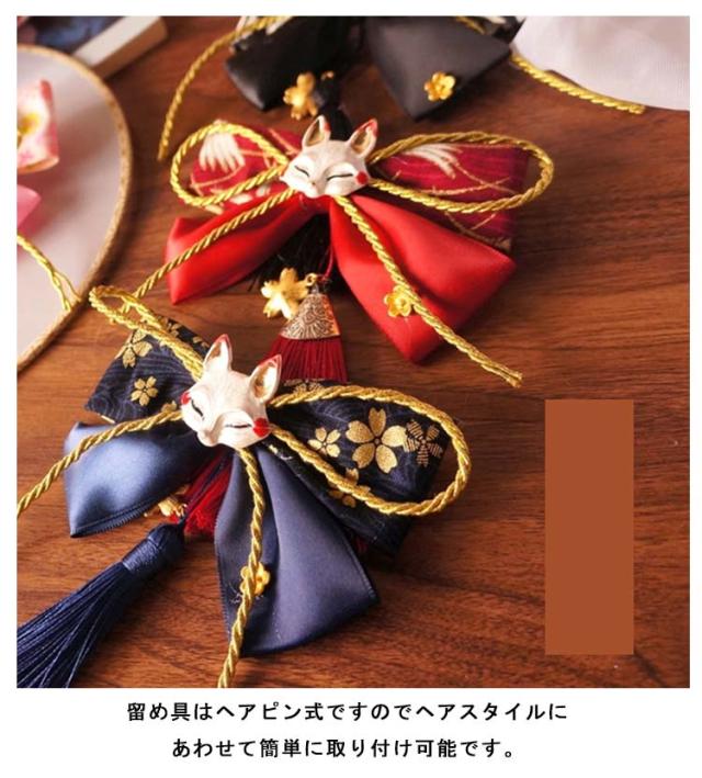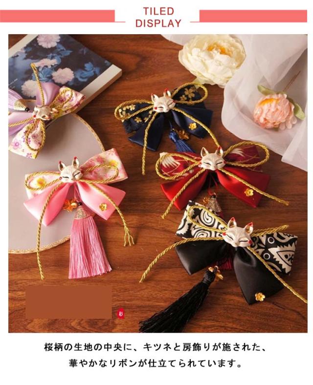 | 卒業式の袴姿におすすめなリボンの髪飾りです。 桜柄の生地の中央に、キツネと房飾りが施された、華やかなリボンが仕立てられています。 成人式の振袖や卒業式の袴姿だけでなく、普段のお着物にもオススメします。 留め具はヘアピン式ですのでヘアスタイルにあわせて簡単に取り付け可能です。 | |