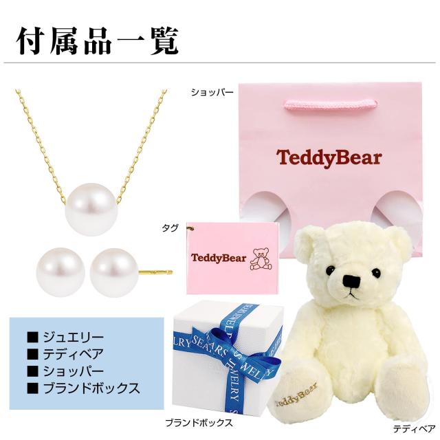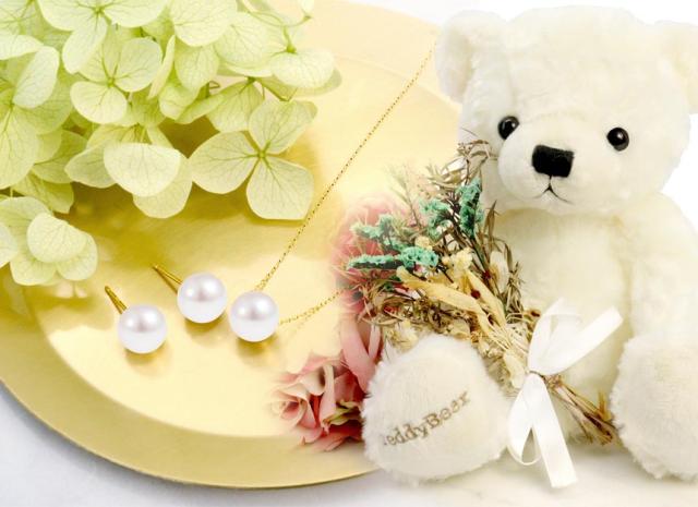 大切な女性への贈りものに…当店限定!完全オリジナルギフトセット、送料無料。人魚の涙ともよばれるあこや真珠を使用したネックレスとピアスを、大人気★ふわふわテディベアのぬいぐるみとセットにして、オンリーワンの特別感とともにお届けします。