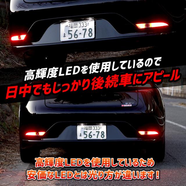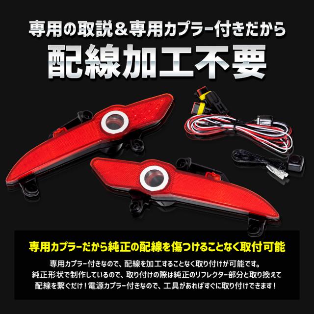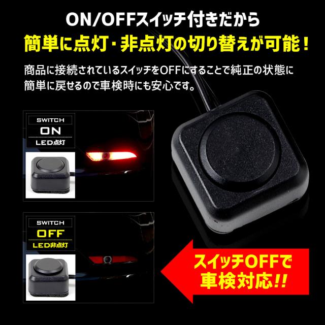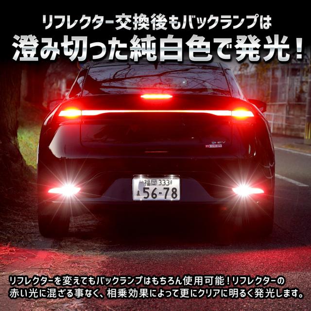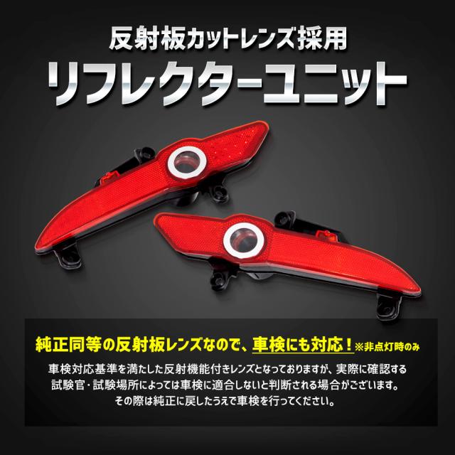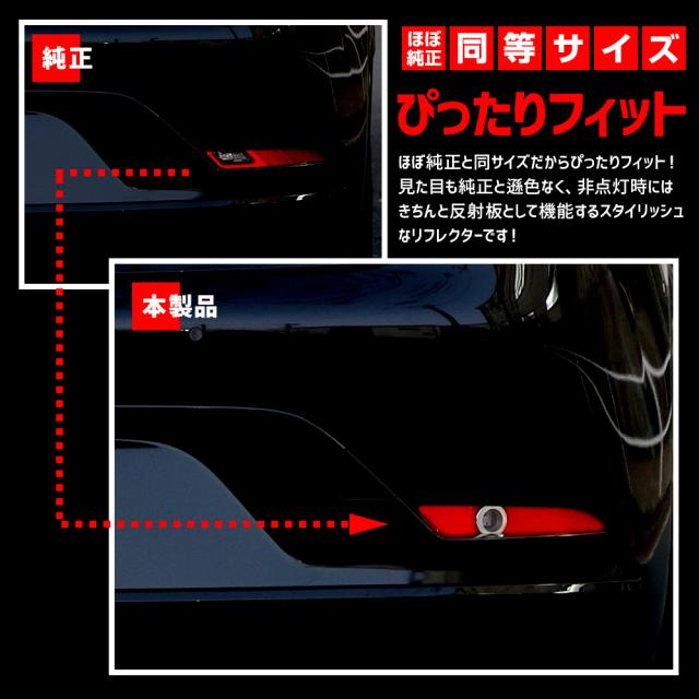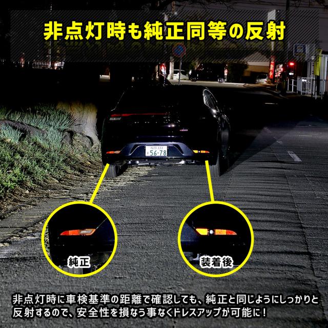 リフレクターを光らせることで後続車からの認識性UP! ポジション点灯・ブレーキでより強く点灯する2段階点灯。 高輝度LEDを使用しているので日中でもしっかり後続車にアピールできます! LEDで光らせることで他車からの認識性が高まり、安全性の向上も期待出来ます。 普段は光らないところが光るため、個性的かつスタイリッシュなリアビューを演出します。 専用設計のため、純正と同じサイズでぴったり違和感なく装着可能。まるで純正のような一体感! 専用カプラー付きだから純正の配線を傷つけることなく取り付け可能なのもおすすめポイントです。 純正同等の反射板レンズを採用しているので、車検にも対応しています。※非点灯時のみ |